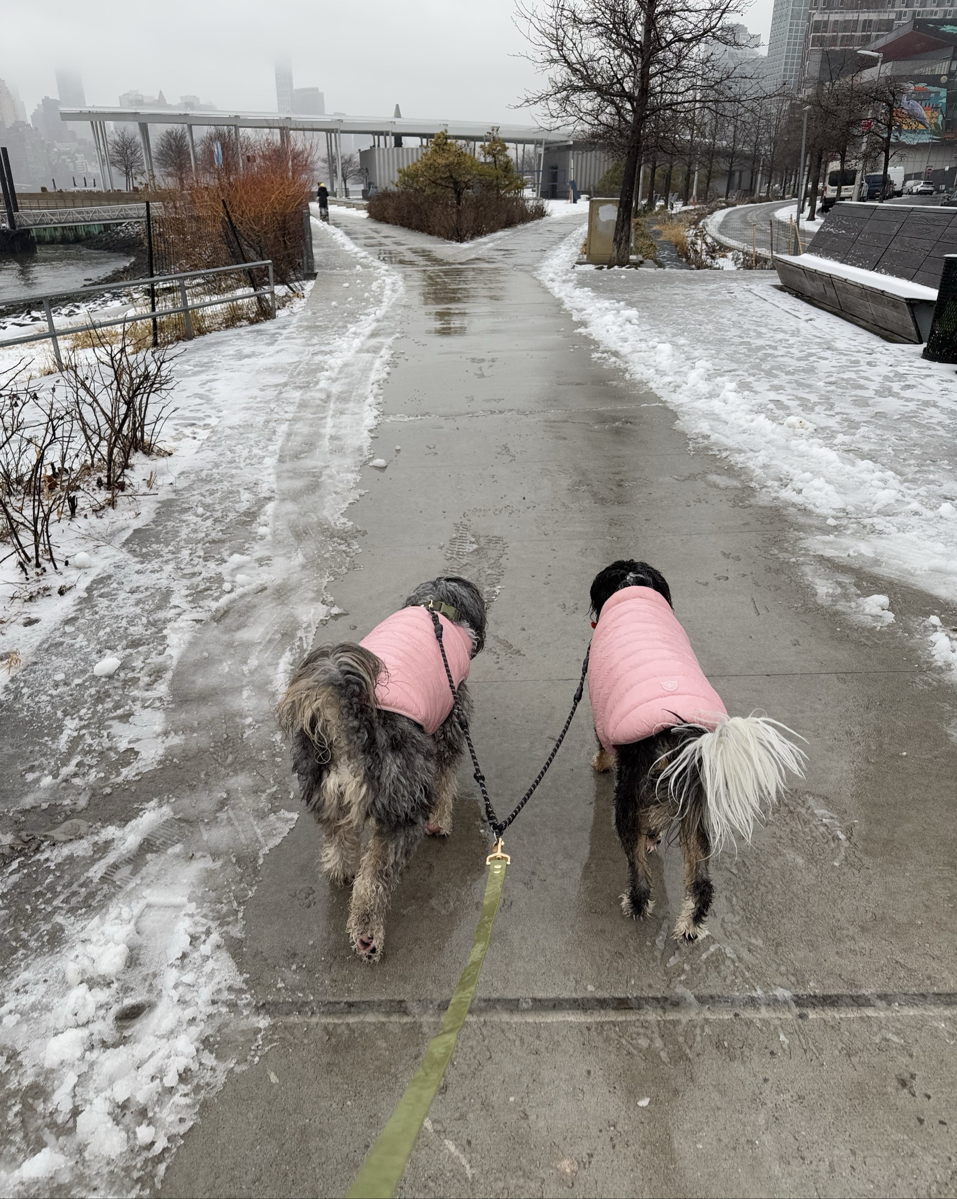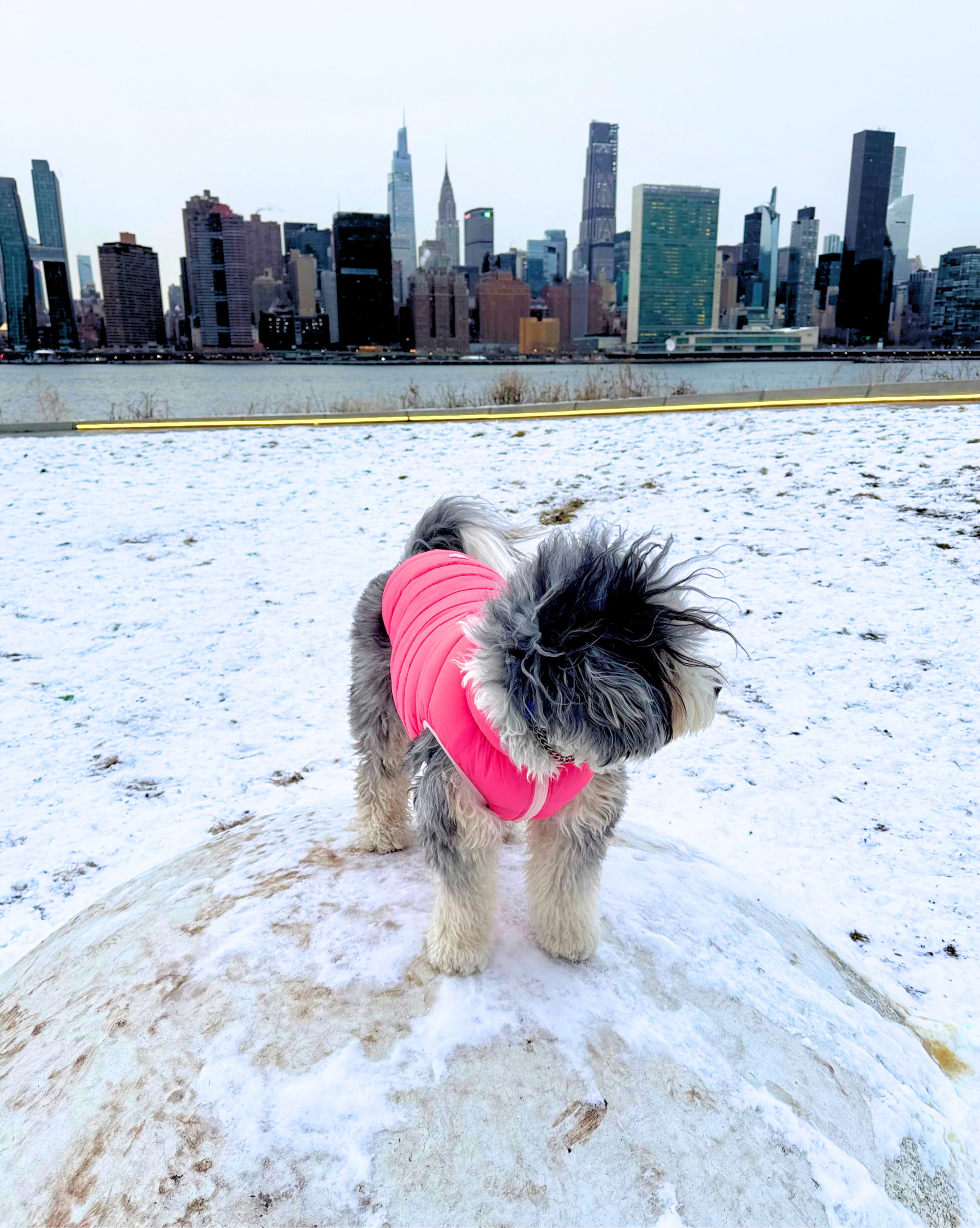 Let me paint you a picture: beautiful waterfront views of the water, Manhattan skyline, and two mini bernedoodles trotting along streets like the majestic fluff balls they are. Sounds perfect, right? It is — except for one thing. That wind is brutal.