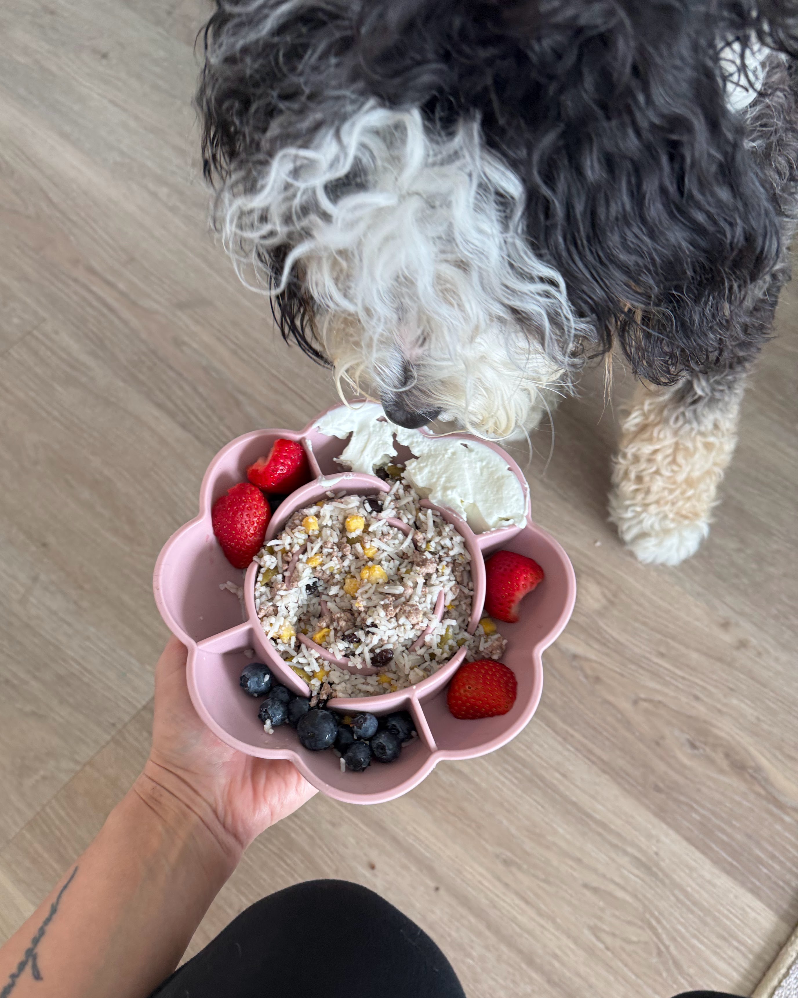 Not only do they help prevent gulping (great for digestion!), but they also make mealtime a little more mentally stimulating. We love mixing up textures and colors in each bowl—today’s spread included rice, ground turkey, blueberries, strawberries, corn, and a little spoonful of Greek yogurt. Beso and Bailey licked their bowls clean… slowly, of course. 😉