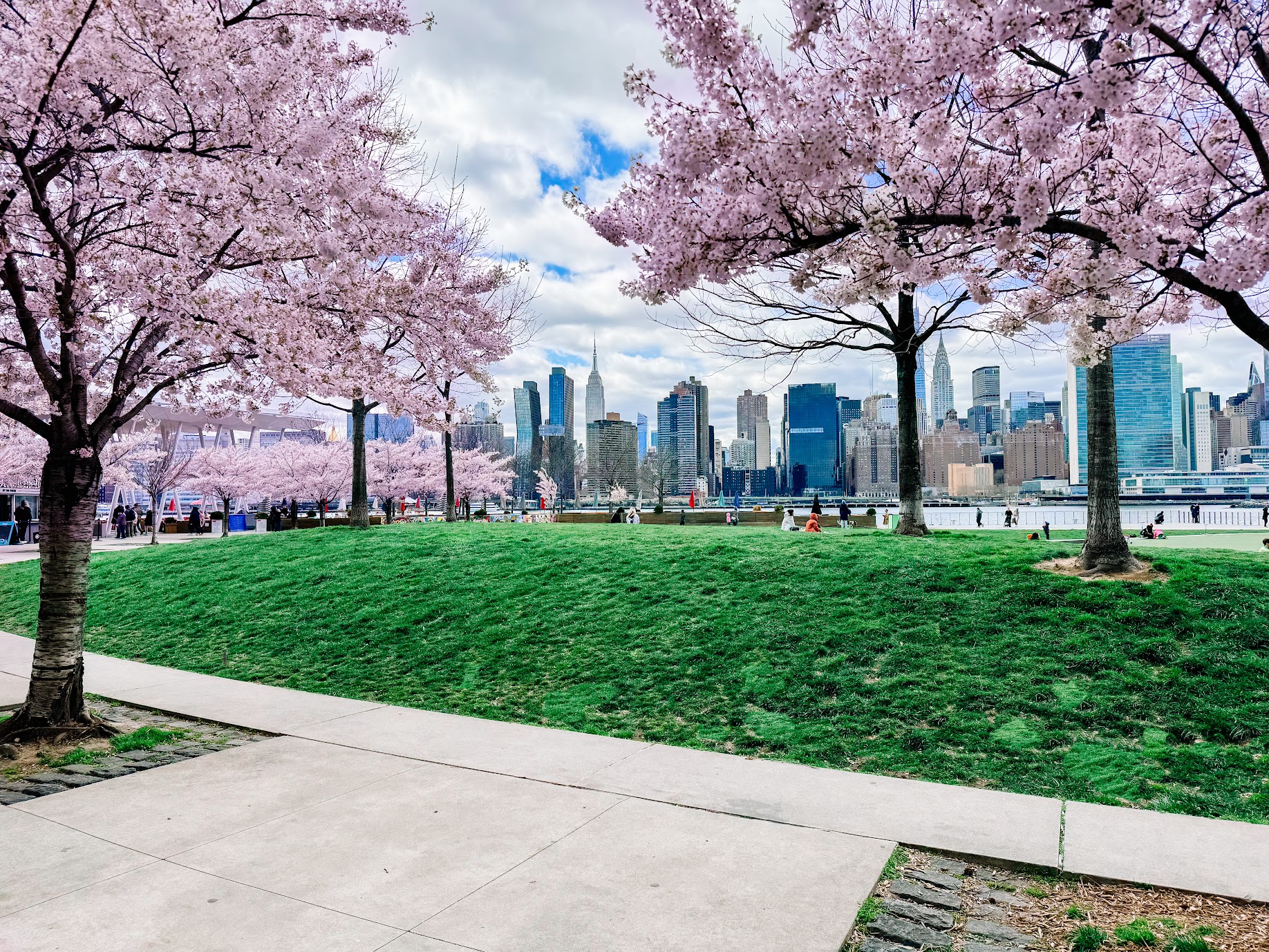 This is our spot — and honestly, it might be the most underrated cherry blossom location in the entire city. Hunter's Point South Park features Yoshino cherry trees that bloom around the park's oval, which boasts stellar views of the Manhattan skyline. The park also has a dog run, a waterside promenade, and picnic terraces, making it a full morning out with your pup. Peak bloom here typically aligns with the broader Yoshino window — early April.